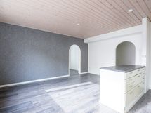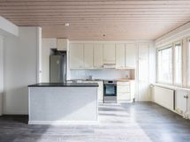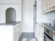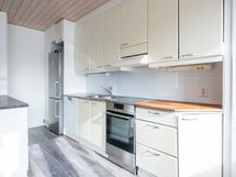 - Keittiön varusteet: Jääkaappipakastin, liesituuletin, astianpesukone ja liesi. Liesi: Induktioliesi. Työtason materiaali: Laminaatti.