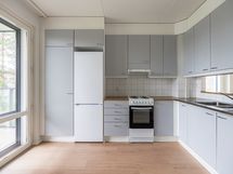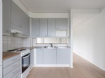 Liesituuletin, Sähköliesi, Jää-pakastinkaappi, Pesukoneliitos, Paljon kaappitilaa, Terästasot, Laminaattitasot
