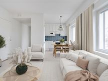 Tässä toimivapohjaisessa kodissa on tilava avokeittiö, jossa astianpesukone, vakioliesi sekä jääkaappipakastin. Avara olohuonetila sekä kauniit vaaleat pintamateriaalit mahdollistavat monipuoliset sisustusratkaisut. Eteisen yhteydessä on erillinen vaatehuone. Laatoitetussa kylpyhuoneessa varaus pesutornille, sähköinen mukavuuslattialämmitys sekä oma sauna. Asumisen mukavuutta tuo mukavankokoinen aurinkoinen avoparveke.
