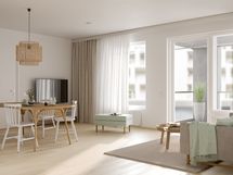 Tässä kodissa on ikkunoita kolmeen ilmansuuntaan, minkä ansiosta huoneistoon pääsee runsaasti luonnonvaloa. Modernissa avokeittiössä on laadukas varustelu, mm. keraaminen liesitaso ja astianpesukone. Säilytystilaa löytyy reilusti kaapistoista sekä toisen makuuhuoneen yhteydessä olevasta vaatehuoneesta. Laatoitetussa kylpyhuoneessa on miellyttävä sähkötoiminen mukavuuslattialämmitys sekä liitännät ja tilavaraus pyykinpesukoneelle ja kuivausrummulle. Lasitetulla parvekkeella on mukava nauttia aamupäivän auringosta.