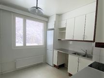 Paljon kaappitilaa, Suuri tiskipöytä, Sähköliesi, Jää-pakastinkaappi