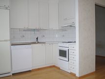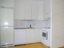 Jääkaappipakastin, sähköliesi, kaapistot.