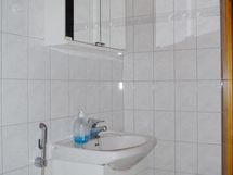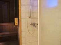 Sauna, sähkökiuas, kylpyhuone, suihku, peilikaappi, pesukoneliitäntä.