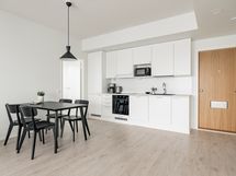Huoneistosta valmiina löytyvät sängyt, sohva, ruokapöytä ja tuolit, valaistus, sekä keittiön perustasoiset kodinkoneet, ruokailuvälineet ja astiat. Huomaathan, että asuntoihin ei sisälly televisiota eikä modeemia internetyhteyttä varten.