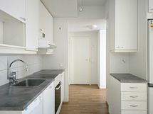 Kodissa on laminaattilattiat ja maalatut seinät. Keittiössä on valkoiset kaapistot metallisilla vetimillä, työtasot ovat puuta jäljittelevät. Keittiön varustukseen kuuluvat keraaminen liesi, jääpakastinkaappi, kapea astianpesukone ja tilavaraus mikroaaltouunille. Kylpyhuoneessa on vaalea laattalattia, seinät on laatoitettu valkoisella ja tummanharmaalla laatalla. Kylpyhuoneessa on mahdollisuus pesutornille.