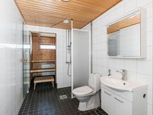 Kylpyhuoneessa on tumma lattialaatta, valkoiset seinälaatat ja pyykinpesukoneliitäntä. Asunnon kruunaa oma sauna sekä lasitettu parveke, joka tarjoaa mukavan lisätilan ympäri vuoden.