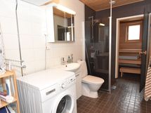 Tässä kodissa on oma sauna, jossa rentoudut arjen päätteeksi. Laatoitettu, tilava kylpyhuone, jossa on kätevä pesukoneliitäntä, tekee arjesta sujuvaa.