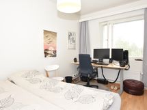 Tilavassa makuuhuoneessa on runsaasti säilytystilaa ja tilaa myös pienelle etätyöpisteelle. Avoin keittiö yhdistyy luontevasti olohuoneeseen, ja lasitetulta parvekkeelta avautuu rauhallinen näkymä puiston suuntaan — täydellinen paikka nauttia vuoden jokaisena päivänä.