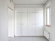 Makuuhuoneessa on runsaasti säilytystilaa koko seinän kattavissa kaapeissa. Tilava kylpyhuone on helppokulkuinen ja sinne mahtuu pesutorni.