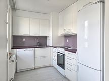 Valoisa ja vaaleasävyinen kaksio, jossa on selkeä pohjaratkaisu ja hyvin suunnitellut tilat. Keittiö on moderni ja käytännöllinen kokonaisuus: valkoiset kaapistot, pastellin liila välitila ja reilu työskentelytaso luovat raikkaan ilmeen.