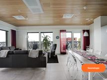 Olohuone on avara ja sen suurista ikkunoista tulvii luonnonvaloa. Olohuoneesta avautuu kulku lasitetulle parvekkeelle, joka tarjoaa mukavan lisätilan arkeen.