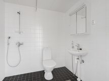 Kylpyhuoneen sisustus jatkaa omaa raikasta linjaansa valkoisine kalusteineen ja seinineen. Lattiassa on mukavuuslämmitys ja tummanharmaa laatoitus antaa modernin säväyksen kylpyhuoneelle. Pyykinpesukoneelle löytyy oma paikkansa ja pesukoneliitäntä.