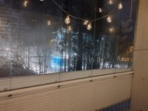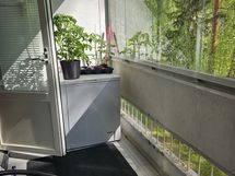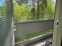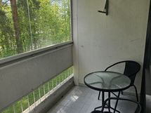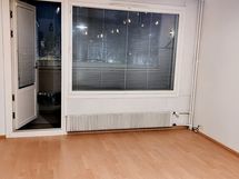 Iso olohuone, jonne tarvittaessa mahtuu vaikka parisänkykin. Olohuoneesta käynti lasitetulle parvekkeelle. Parvekkeella pistorasia. Rauhallinen näkymä talon puistomaiselle takapihalle.