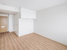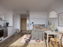 Tämä neljännen kerroksen yksiö on toteutettu todella tehokkaasti. Säilytystila on toteutettu yläkaapeilla, jolloin huonekaluille jää enemmän tilaa. Asuntoon mahtuukin mukavasti arjen peruskalusteet, kuten sänky, ruokapöytä ja nojatuoli tai pieni sohva. Huolella valittu tehosteseinä sointuu kauniisti asunnon vaaleisiin sävyihin.