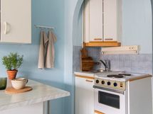 Jääkaappi, liesi/uuni, saareke, kaapistot.