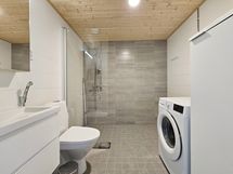 Varusteet: suihku, peilikaappi, allaskaappi, pesukoneliitäntä, WC