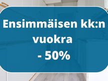 Uudelle asukkaalle heti vapaana todella tilava, siisti ja valoisa kolmio taloyhtiön neljännestä kerroksesta! Ensimmäisen kk:n vuokra -50%, kun sitoudut asumaan asunnossa väh. 12kk.