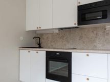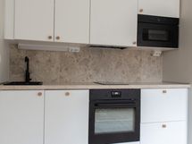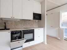 Keittiöstä löytyy integroitu astianpesukone, vakiona mikro, integroitu jääkaappipakastin. Kylpyhuoneessa on kapealle pyykinpesukoneelle liitäntä.