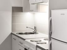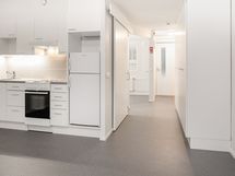 Työtasot: laminaatti. Kylmäsäilytys: jääkaappi/pakastin. Asunnoissa joko lattialiesi tai keraaminen keittotaso