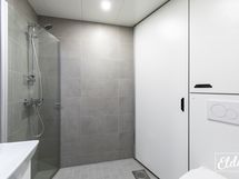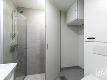 Varustus: suihkuseinä, pesukoneliitäntä, lattialämmitys, wc-istuin, suihku, peili, kiinteät valaisimet, kylpyhuonekaapisto.