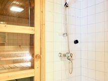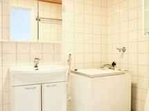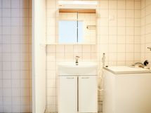 Suihku, suihkuseinä, peilikaappi, allaskaappi, pesukoneliitäntä, seinät ja lattia laatoitettu, bidee käsisuihku.