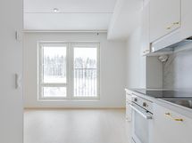 Asunnon pintamateriaaleihin on valittu Klassinen-teeman mukaisia pehmeitä ja luonnonläheisiä sävyjä, jotka luovat kauniin pohjan sisustuksellesi. Tehosteseinä luo kotiin lämpimän tunnelman vaalean keittiön parina. Kultaiset vetimet kruunaavat kokonaisuuden.