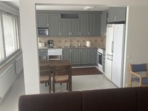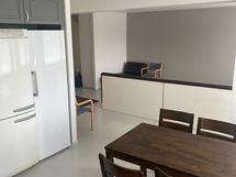 Tilaa isolle ruokapöydälle, Laminaattitasot, Astianpesukone, Sähköliesi, Liesituuletin, Jää-pakastinkaappi, Jää-viileäkaappi