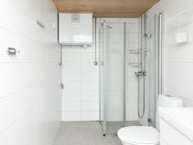 Eteistilasta löytyy liukuovikaapistojen takaa kätevää tankosäilytystilaa sekä pyykki- ja siivouskaappi. Kylpyhuoneeseen kuljetaan suoraan eteisestä, ja sieltä löytyy säilytystilaa altaan alakaapista ja peilikaapista. Suihkutila sijoittuu omaan nurkkaukseensa ja on rajattu suihkuseinillä. Vieressä on tila ja liitännät omalle pyykinpesukoneelle.