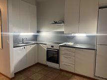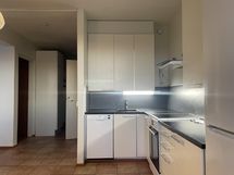 Jääkaappipakastin, keraaminen liesi, liesituuletin, astianpesukone, kaapistot, kiinteät valaisimet.