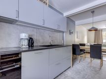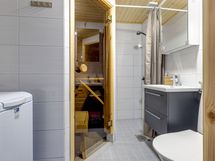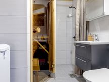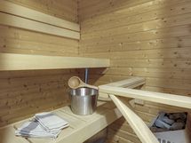 Löylyt otat omassa lasiovellisessa saunassa, jonka yhteydessä tyylikäs kylpyhuone pesukoneella. Vilvoitteluun löytyy oma terassi.