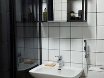 - Suihku, Suihkuseinä, Pesukone, Peilikaappi, Laattalattia, Allaskaappi, Laattaseinä, Lattialämmitys, Led valot