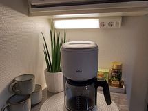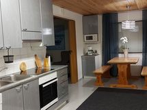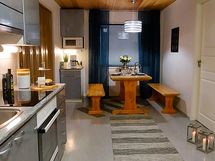 Keittiössä mm. jääkaappi, pakastin, astinapesukone, induktioliesi ja uuni, liesituuletin, mikroaaltouuni, kahvinkeitin, vedenkeitin, ruoanlaittovälineet, ruokailuvälineet