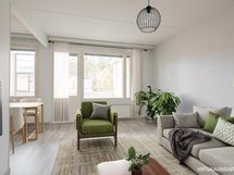 Tämä 3. kerroksen viihtyisä ja tilava kolmio on juuri peruskorjattu. Kaapistot ja lattiat ovat vaaleansävyisiä ja kylpyhuoneen lattia on tummanharmaa laatta. Peruskorjauksen yhteydessä kaikkien 2.-3. kerroksen asuntojen parvekkeet lasitetaan. Tämän asunnon voi myös vuokrata (1185 €/kk) toistaiseksi voimassa olevalla sopimuksella. Asukasvalinnat tehdään hakemuksen perusteella. Täytäthän aso- tai vuokrahakemuksen sivuillamme: www.asuntosaatio.fi ja ota yhteyttä: raija.saario(at)asuntosaatio.fi