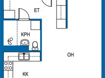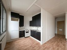 - Astianpesukoneliitäntä, jääkaappi-pakastin, sähköliesi. Lisätietoja: Keittiöön saa joko pöydälle tai kaapin sisään asennettavan astianpesukoneen. Normaalikokoinen astianpesukone ei mahdu keittiön puolelle.