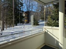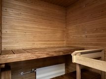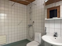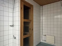 Kylpyhuoneessa on harmaa muovimatto ja valkoisella laatoitut seinät sekä pyykinpesukoneelle liitäntä. Arjen luksusta tuovat oma tilava sauna ja lasitettu parveke sisäpihalle.