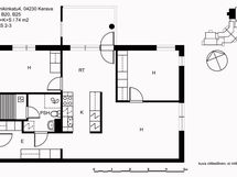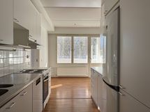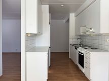 Tämän tilavan ja valoisan Lumo-kodin lattiat ovat laminaattia ja seinät maalattu. Keittiössä on valkoiset kaapit metallivetimillä, myös työtaso ja välitilan laatta ovat valkoiset. Keittiön varusteisiin kuuluvat jääkaappipakastin, liesi ja astianpesukone. Mikroaaltouunille on tilavaraus. Asunnossa on hyvin säilytys- ja työtilaa.