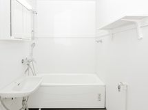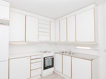 Keittiön varustukseen kuuluu lattiauuni, perinteinen liesi ja jääkaappipakastin. Kylpyhuone on myös raikkaan valkoinen ja omaa kylpyammeen. Olisiko tämä uusi vuokrakotisi?