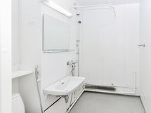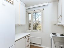 Keittiö on oma kokonaisuutensa ja siellä on hyvin työskentelytilaa. Jääkaappipakastin kuuluu varustukseen. Kylpyhuone on laatoitettu ja pyykinpesukoneelle on liitännät.