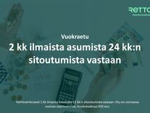 Kaksi ensimmäistä kuukautta vuokra 0€. Vuokraedun saaminen edellyttää 24 kuukauden sitoutumista asuntoon. Etu voimassa uusiin sopimuksiin.