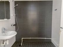 Kylpyhuoneessa on muovimatto ja peltiseinät. Pyykinpesukoneelle on mahdollisuus.