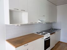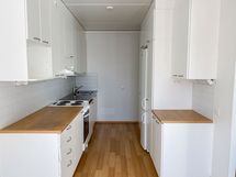 Kodin lattioissa on muovimatto, paitsi keittiössä, jossa on laminaatti. Seinät ovat maalatut. Keittiö on moderni valkoisin kaapistoin ja laminaatin sävyisen työtason kanssa. Välitilassa on valkoiset laatat. Keittiöön on lisäksi mahdollista asentaa oma astianpesukone.