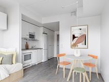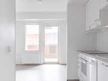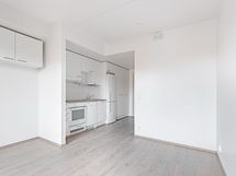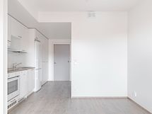 Asunnossa on valkeat seinät sekä lattiat vaaleaa laminaattia. Vaaleat pinnat jatkuu keittiössä, jossa värimaailmana myös vaalea. Asumismukavuutta tuo keraaminen liesi, astianpesukone sekä jääkaappipakastin.