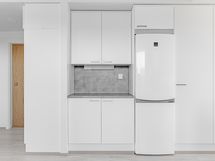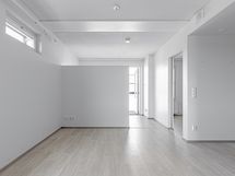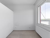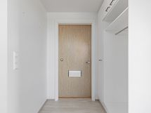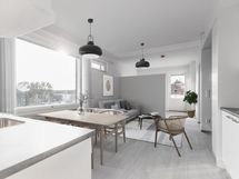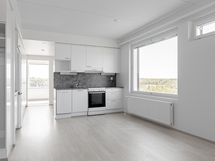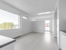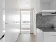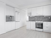 Asunnossa on vaaleat pinnat, seinät ovat valkoiset ja lattiassa vaalea laminaatti. Vaaleat pinnat jatkuu keittiössä, jossa värimaailmana myös valkoinen. Asumismukavuutta tuo keraaminen liesi, astianpesukone sekä jääkaappi pakastinlokerolla.