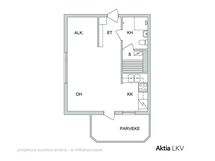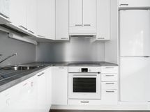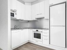 - Kaapistot, induktioliesi, liesikupu, mikroaaltouuni, jää/pakastinkaappi ja astianpesukone. Lattia vinyylilankkua.