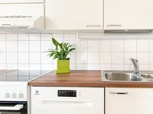 Keittiö on toimiva ja kaappitilaa löytyy hyvin. Keittiössä on myös astianpesukone. Keittiön edustalle mahtuu ruokailuryhmä, ja keittiön erottaa olohuoneesta liukuovi.