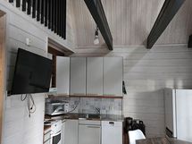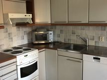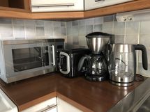 Keittiössä on astianpesukone, paahdin, kahvinkeitin, vedenkeitin ja mikro.