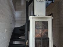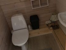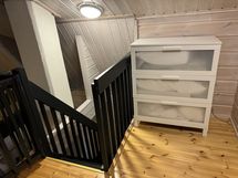 Yläkerrassa on toinen makuuhuone ja wc, sekä pieni oleskelutila. Yläkerrassa on portaiden yläpäässä portti.