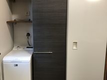Kodinhoitohuoneessa on kuivauskaappi ja pyykinpesukone sekä imuri.