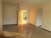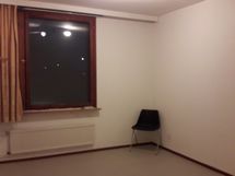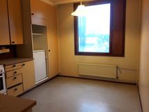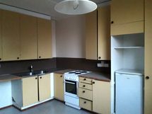 - Tilavassa keittiössä uudehko jääkaappi, sähköliesi ja keittiökaapistot.
