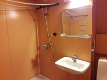 - Tilavassa kylpyhuoneessa suihku, allas, peili, wc-istuin, pikkukaapisto ja pesukoneliitäntä.